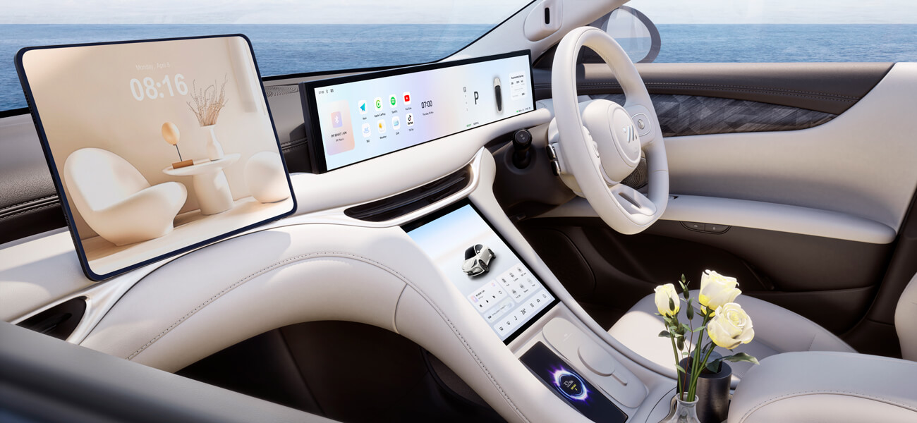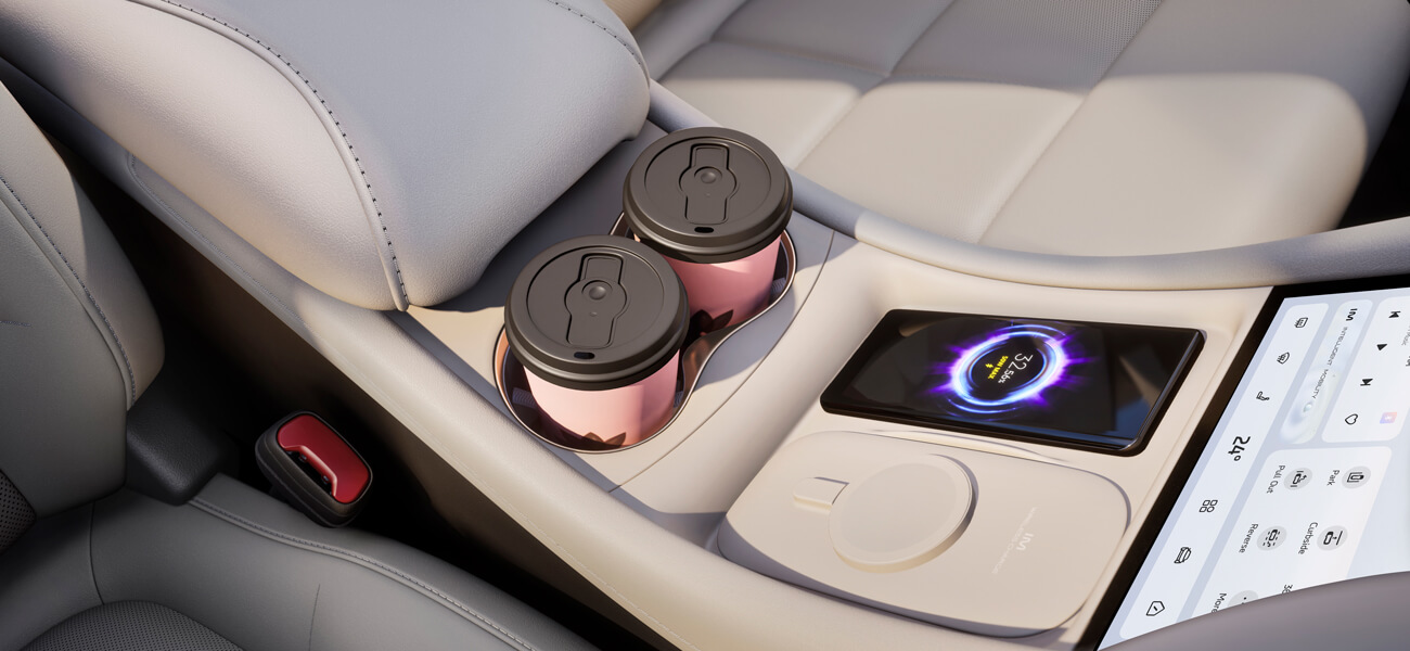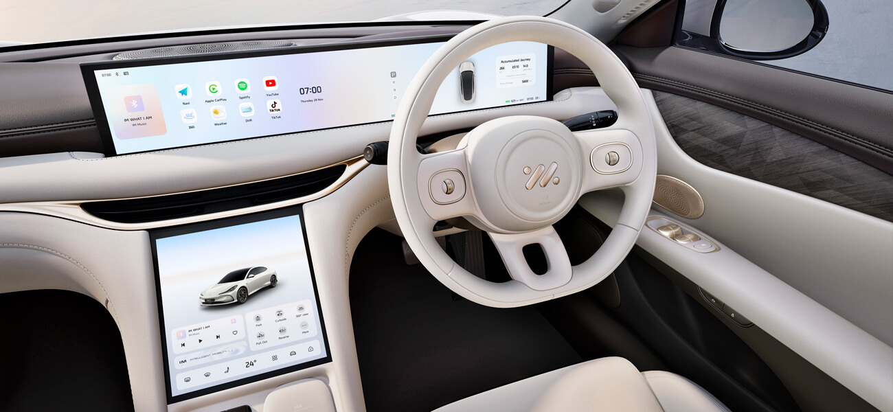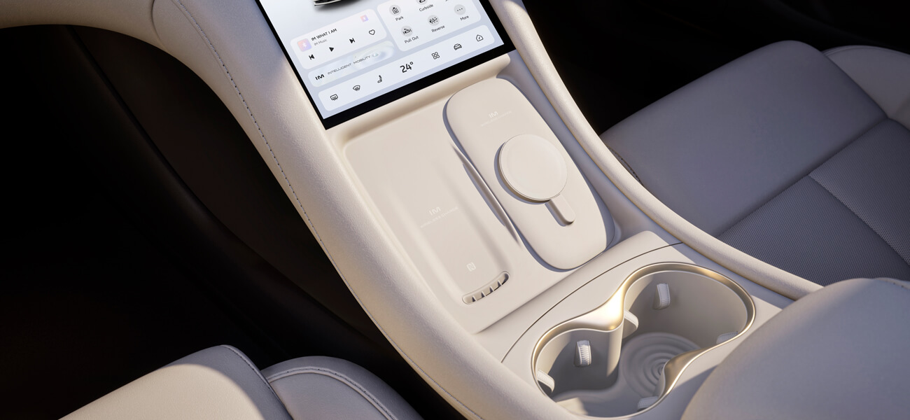 Within the IM5's cabin, smart technology is intuitively placed. Driven by the powerful Qualcomm Snapdragon® 8295 chip, every essential vehicle functionality responds promptly. Command your experience via the sharp 10.5" central touchscreen and the immersive 26.3" infotainment display, seamlessly integrating wireless Apple CarPlay® and Android Auto™. Additionally, a clever ventilated wireless charging mat provides convenient power for your mobile device throughout your journey.