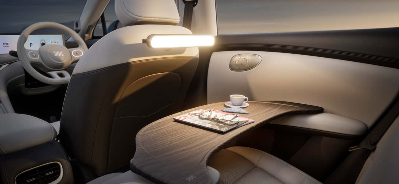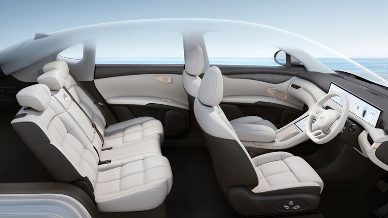 IM6's interior has been designed to be the pinnacle of comfort. Measuring at 4,904mm long, 1,988mm wide and standing 1,669mm tall, IM6's size enables it to have more space and more comfort for all of its passengers. Soft upholstery is prevalent throughout the interior, with heated and cooled seats as standard. A panoramic glass roof adores passengers, fostering a sense of space and openness.